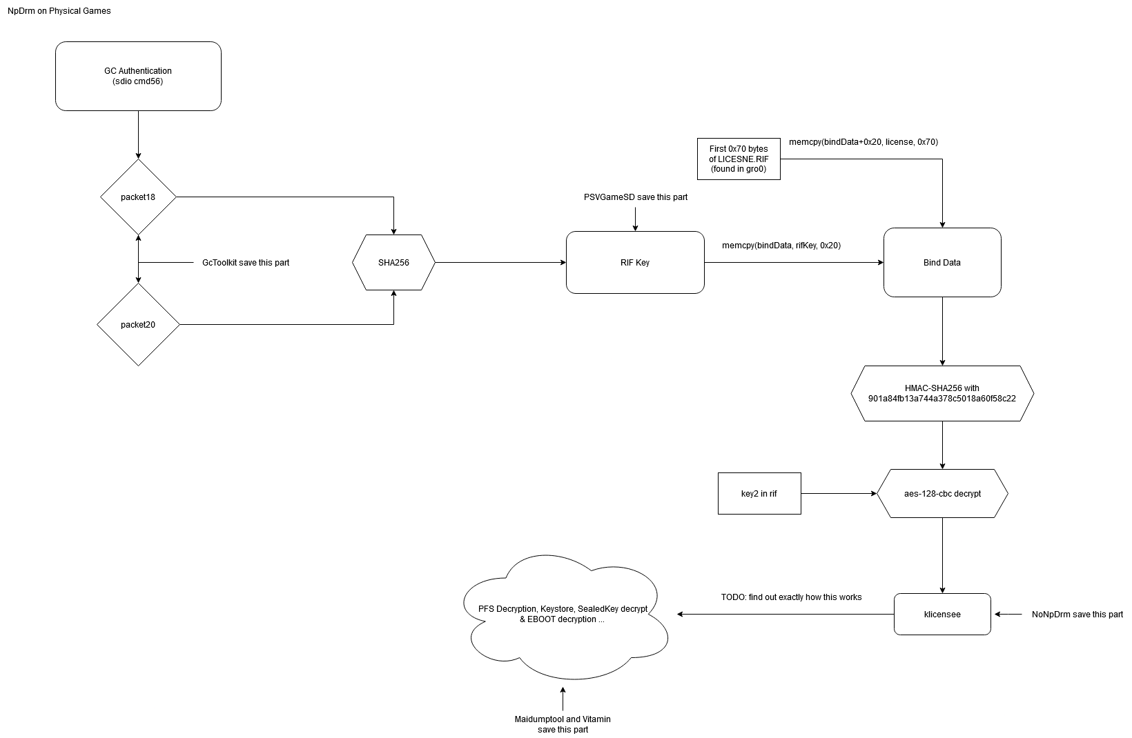 moving on from there we have now validated the cart and vita, and the rest of the protocol is about exchanging two per-cart keys; (p18 and p20) which are used to decrypt the license rif to derive the klicensee for decrypting the game executable.