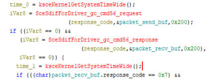 and now we just insert a vita cart into the device and ... the cart doesn't authenticate at all anymore?? what? why?? well if we take a look at ghidra decompilation. between one of the scesdifSend and sceSdifRecv there is a timing check! it calls ksceKernelGetSystemTimeWide() at before sending anything, and then again after sending it. and if it takes more than 5000 microseconds it'll fail the authentication! .. but.. why?? for what reason could they possibly have done this? its not just a timeout since it only seems to cover 2 of the 20 packets!
