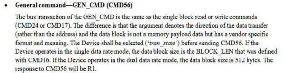 anyway, once you have that, you can find that the way SD & eMMC cards work is via some numbered commands theres also CMD1, CMD2, CMD3, etc which all mean different things, the one we're interested in here, as has been kinda hinted at is CMD56, which is defined under "Application Specific Commands" and is labeled "Generic Command" or "GEN_CMD;
