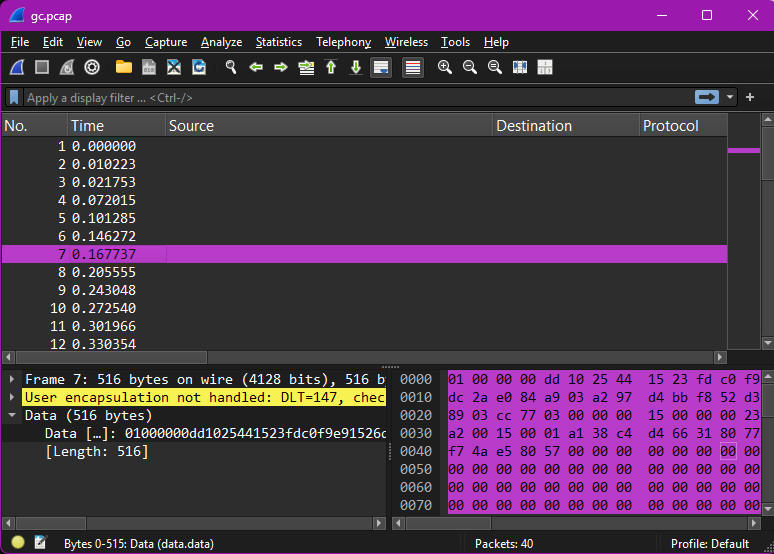 I opted to try make it use the pcap format because it's actually relatively simple, and allows me to analyze these packets using standard tools for packet analysis like Wireshark Which even allows me to write a descriptor in LUA to parse out the format; to figure out how it works;