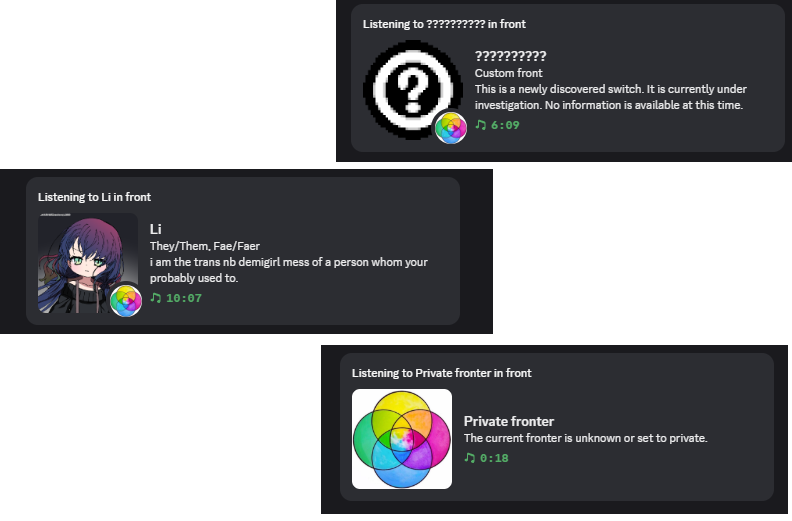 Plural Rich Presence is an application to show who is currently set as "In Front" inside the Simply Plural, It ha multiple ways of functioning, it can either implementing a discord client itself, or running via RPC -- exactly how any game or other software would do it; the downside of that is that Discord, *and* the rich presence program, both have to be running at the same time. it is also possible, but unconfirmed that using it in such a way (i.e not via RPC) could be breaking discords terms of use, particularly the section on account automation I do not really consider this 'automation, no less than what you can do already can with RPC; If you do not know what a "Plural System" is, and none of this page makes any sense, this both is probably not for you, but also; check out our DID page, or other related resources.
